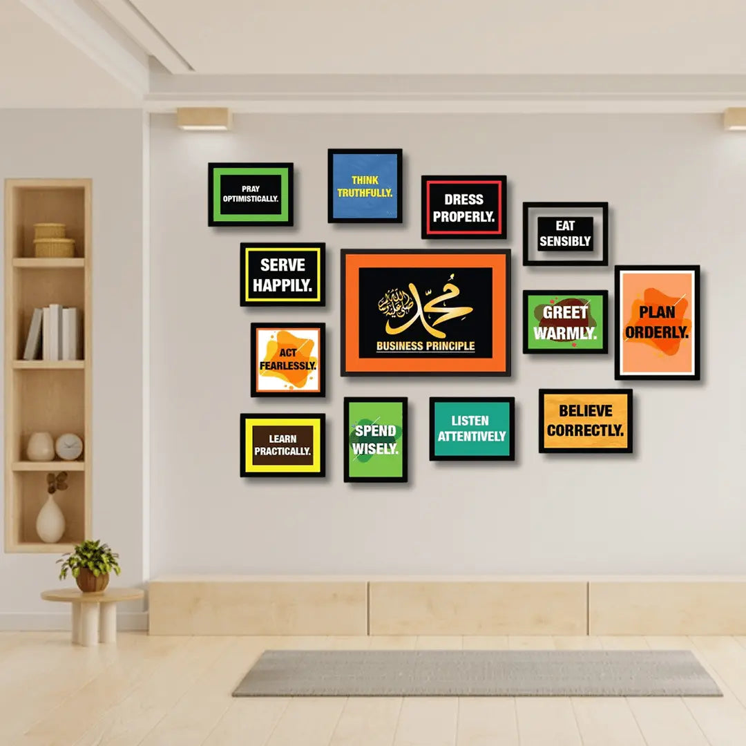 Embrace the wisdom of Prophet Muhammad (PBUH) with this beautifully crafted 13-panel wall art, featuring his business principles. Each panel represents a unique aspect of his teachings, offering not only spiritual inspiration but also a visually captivating design that will enhance any room. This canvas art is perfect for those who want to bring a sense of purpose and guidance into their home or office. With its sleek and modern layout, this wall painting blends Islamic values with contemporary wall decor, making it an ideal choice for wall frames in Pakistan. Add this meaningful piece to your wall art collection today and transform your space into a place of reflection and wisdom.