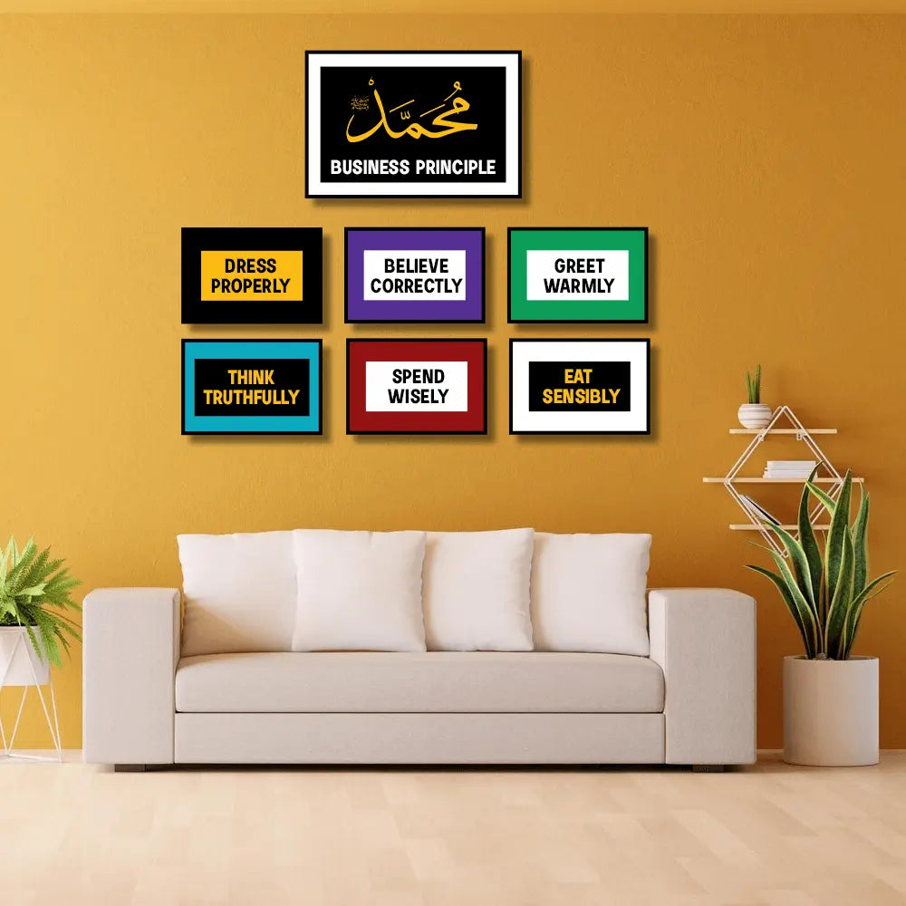 Discover the profound wisdom of the Business Principles of Prophet Muhammad #3 in a breathtaking 7-panel wall art piece. This elegant canvas art brings together spirituality and professional insights, perfect for those who appreciate both aesthetics and meaningful messages. Each panel features intricate designs that reflect timeless principles, making it an inspiring addition to any office or home decor. The versatile nature of this wall painting allows it to enhance any setting, whether it’s a corporate environment or a personal space. With its unique wall art design, this piece not only serves as an eye-catching decor item but also promotes thoughtful conversations and reflection. Perfect for wall frames in Pakistan, this artwork is a beautiful way to express your values and inspirations.