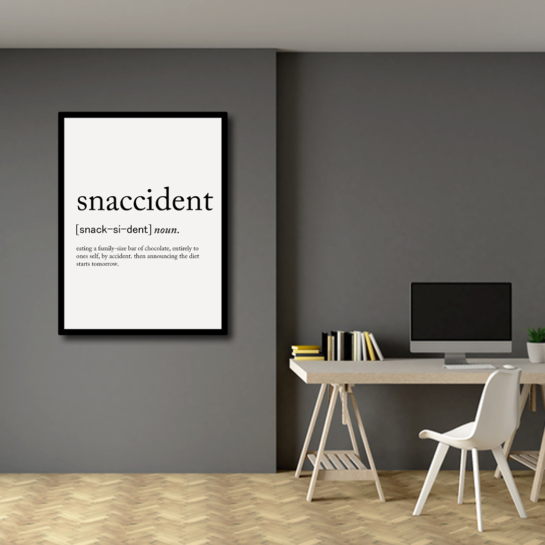 Add a dash of humor to your home with the Modern Minimalist Snaccident Definition Wall Art. This canvas art piece captures the essence of those moments when you "accidentally" finish an entire snack – a relatable sentiment for many! Designed with clean lines and a minimalist aesthetic, it’s perfect for modern kitchens, dining rooms, or casual spaces. The sleek black text on a white background complements a range of decor styles, making it easy to integrate into any wall art collection. Whether you’re a snack lover or just enjoy a good laugh, this witty wall art is sure to be a hit. Ideal for adding personality to your space, it also makes a thoughtful gift for friends or family who appreciate a lighthearted touch in their decor. Embrace your snacking habits with this stylish canvas art, and let your walls tell a fun story.