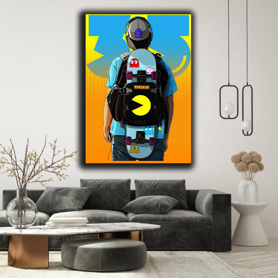 Transform your walls with "Pac-Man by The Dark Inker," a captivating piece of retro wall art that brings the iconic arcade game to life. This high-quality canvas painting features a dynamic depiction of Pac-Man and his classic nemeses, adding a vibrant, nostalgic touch to your decor. Ideal for game rooms, living spaces, or offices, this wall art design is perfect for those who cherish classic video games. The artwork is expertly framed, making it a standout piece in any wall decoration collection. Elevate your interior design with this unique, playful wall picture that merges timeless gaming charm with modern canvas art.