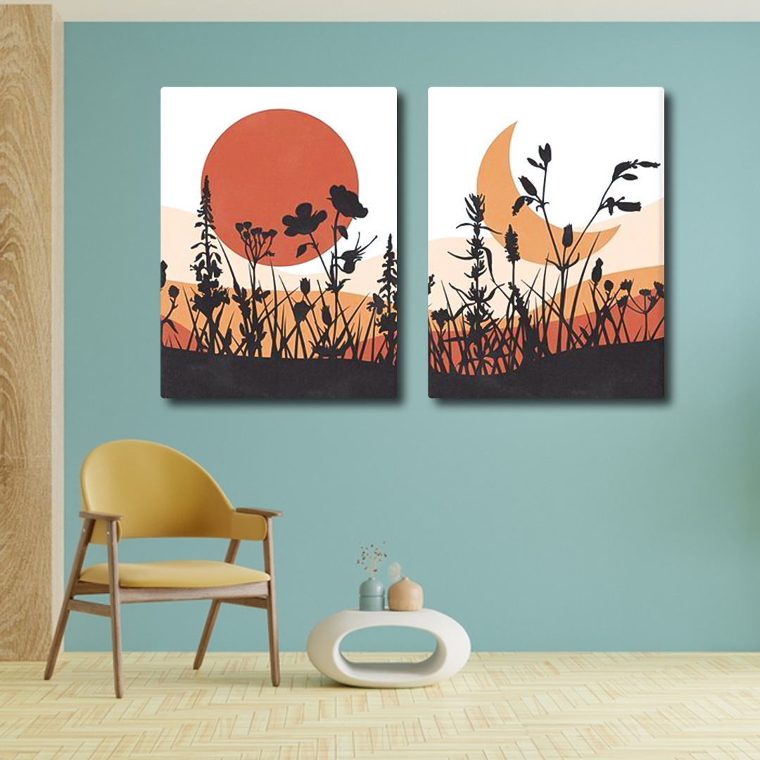 Elevate your interior with the Sun Moon Mountain Botanical Canvas, a captivating 2-panel wall art set that merges natural elements with artistic flair. This exquisite canvas features a beautiful composition of sun, moon, and mountain designs, bringing a sense of tranquility and connection to nature into your living space. Perfect for any room, this piece serves as a focal point that enhances your wall decor with its sophisticated, yet calming presence. Ideal for those who appreciate fine wall art, this canvas adds a touch of elegance and serenity to your home or office, making it a versatile choice for stylish wall decoration. Embrace the allure of nature with this stunning wall art design, available in high-quality canvas frames.